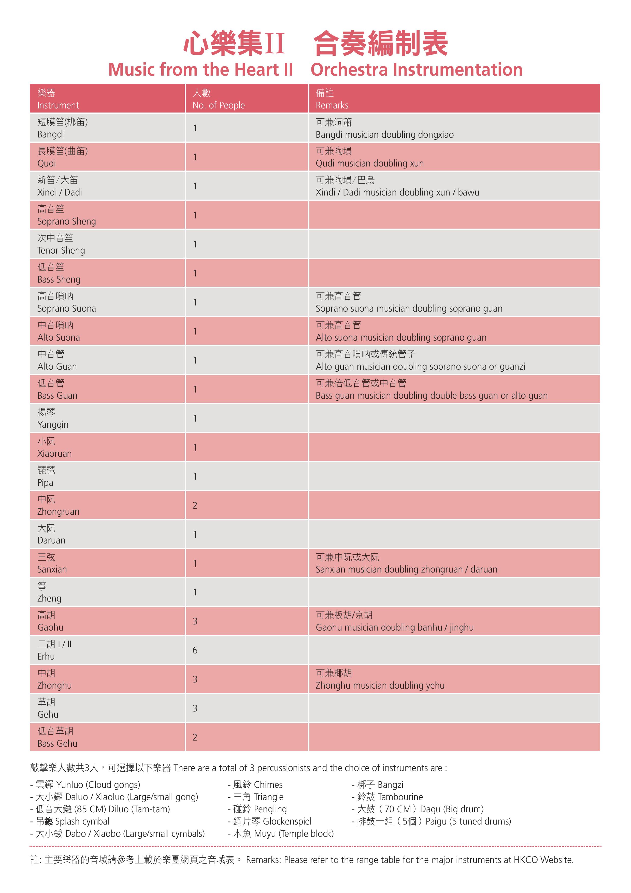 (For the 38-piece setup, please refer to the attached orchestra Instrumentation; and for the tonal range of instruments for the Chinese orchestra, please refer to Standard Orchestra Instrument Range Chart and Page Format of the Full Score Configuration of the Orchestra)