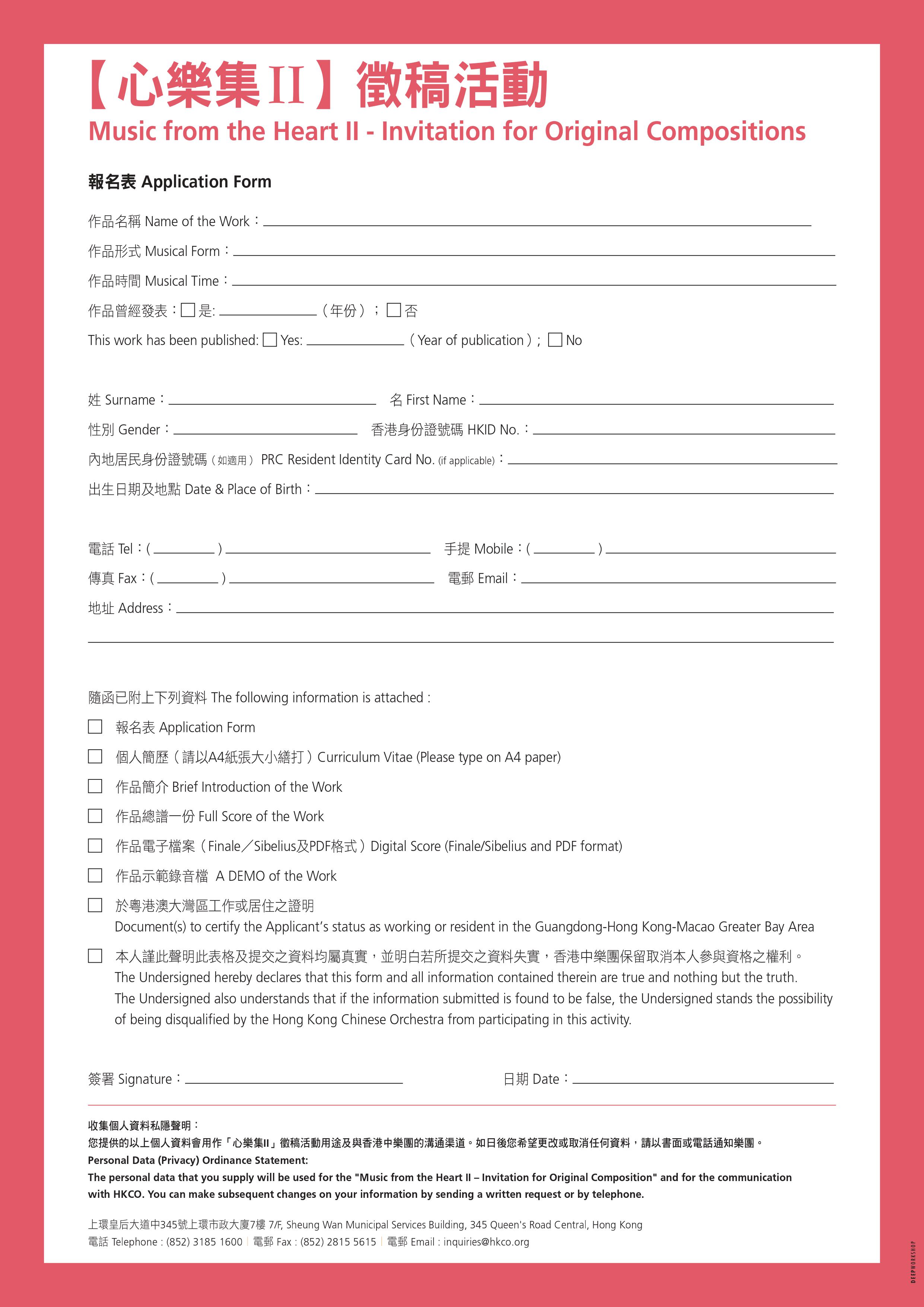 • All submissions should be sent by mail to reach the office of the Hong Kong Chinese Orchestra not later than 31 January 2020 (by postmark date).